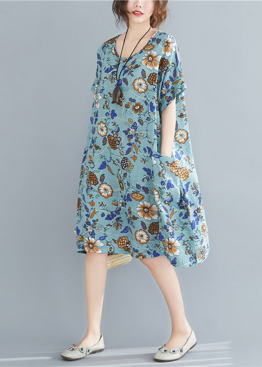 Blue Print Cotton Maxi Dresses Oversized Pockets Summer