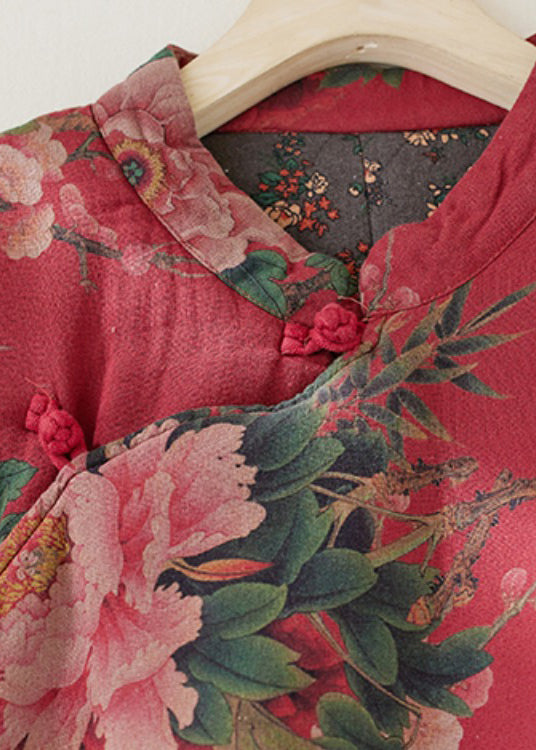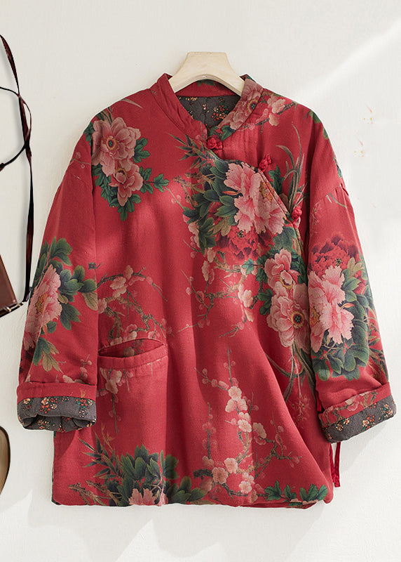 Bohemian Red Pockets Print Lace Up Fine Cotton Filled Coat Spring