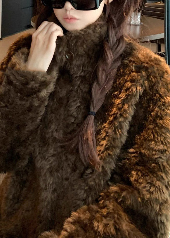Boutique Beige Stand Collar Button Faux Fur Coat Winter