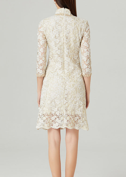 French Beige Stand Collar Nail Bead Oriental Button Lace Mid Dress Spring