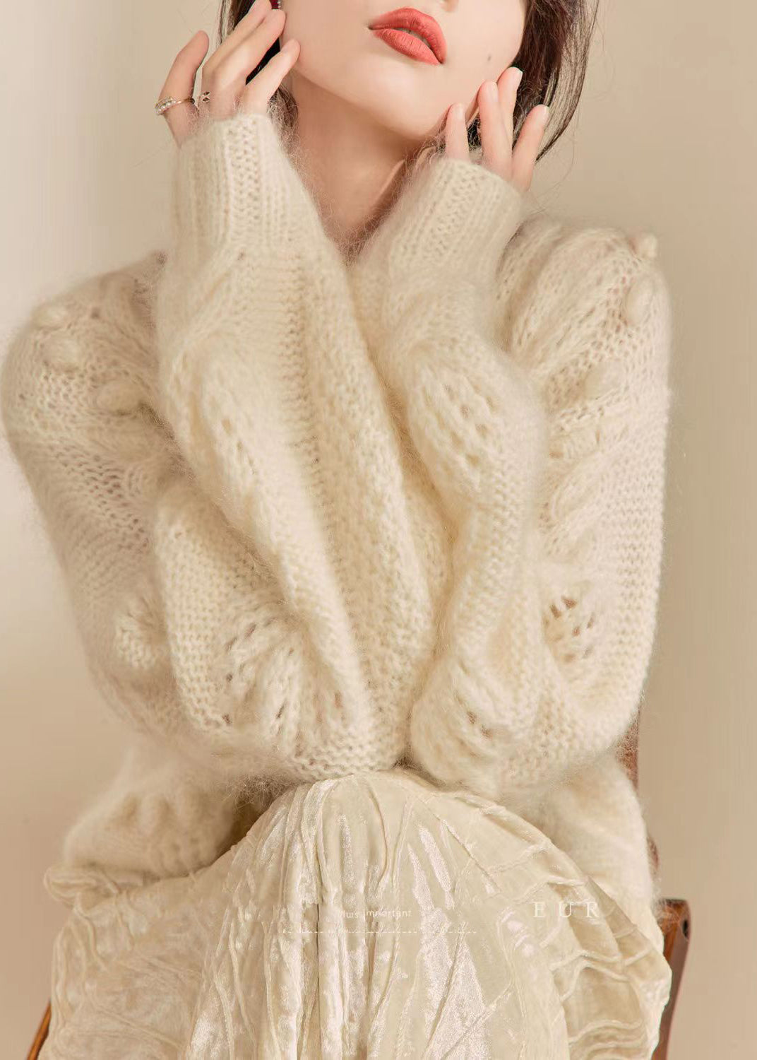 French Beige V Neck Hollow Out Knit Sweater Tops Spring