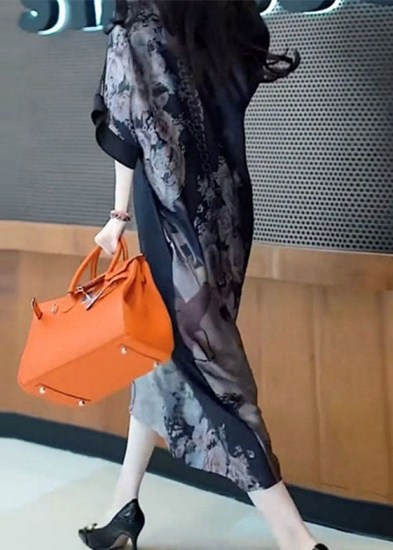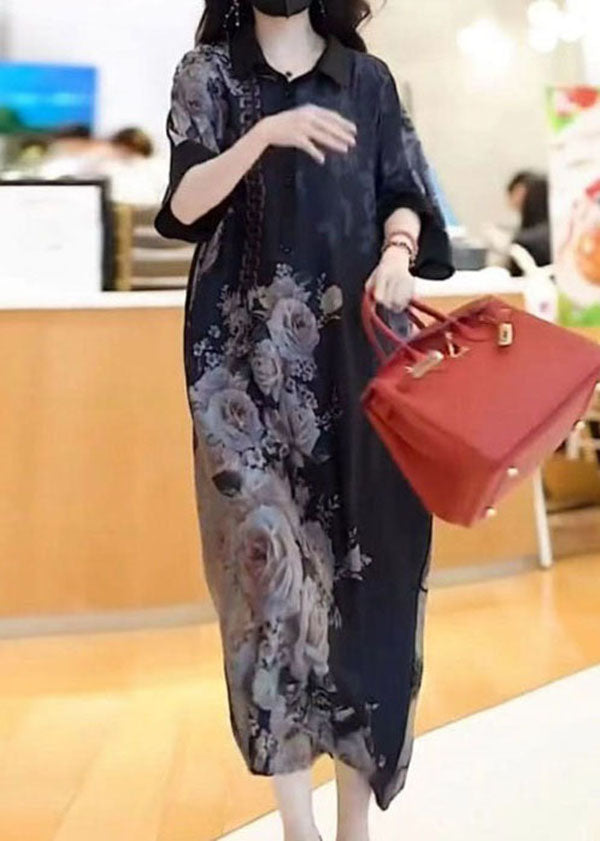 French Black Peter Pan Collar Print Patchwork Silk Dress Summer