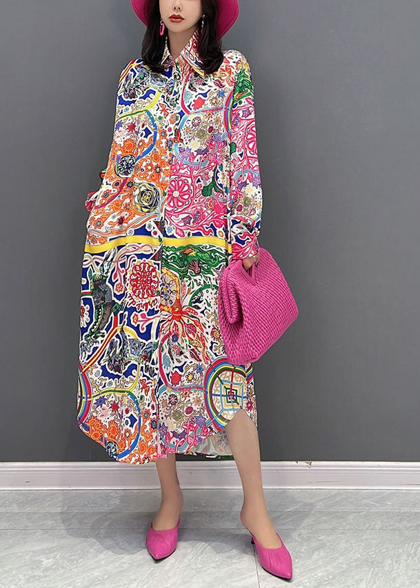 French Red Peter Pan Collar Print Shirt Dress Long Sleeve