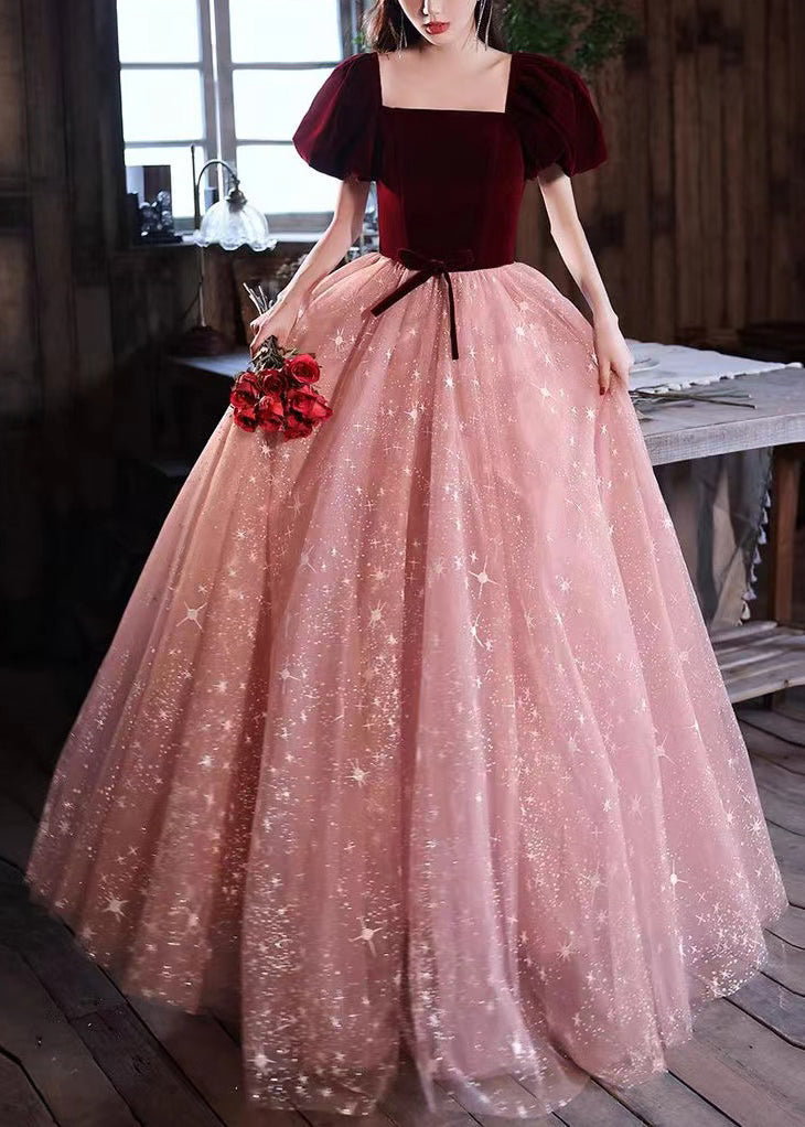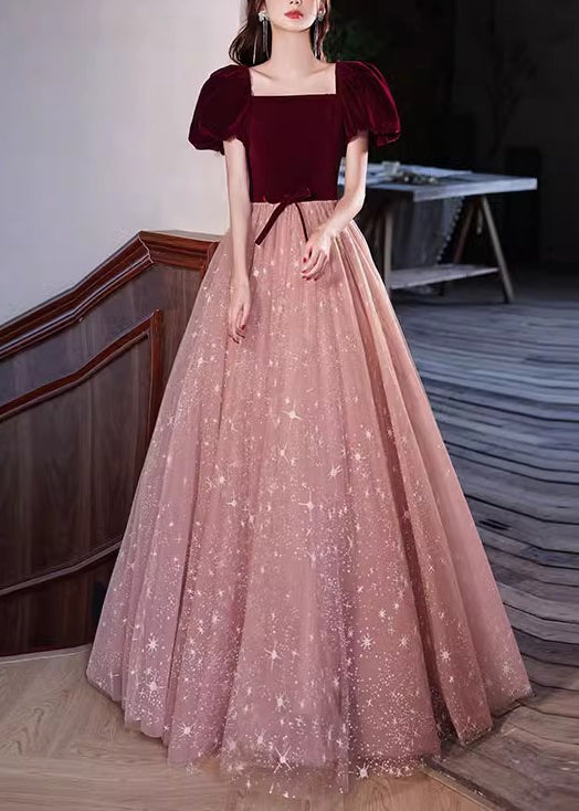French Wine Red Square Collar Patchwork Silk Maxi Dress Summer