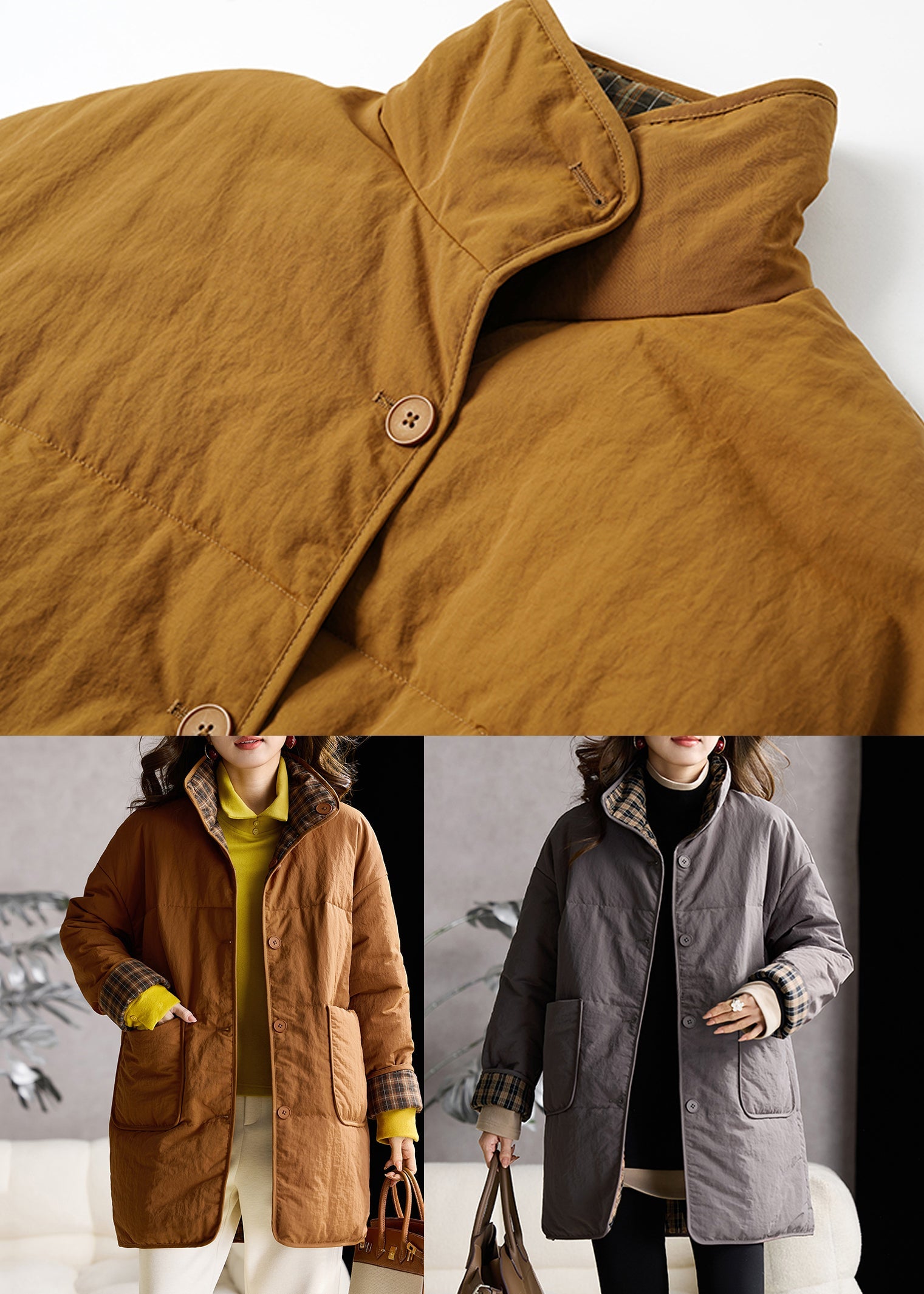 Grey Pockets Fine Cotton Filled Puffers Coat Stand Collar Winter