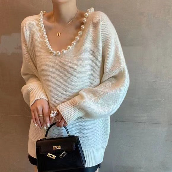 Handmade Red V Neck Nail Bead Thick Knit Sweaters Fall