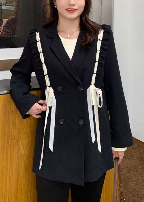 Italian Black Lace Up Pockets Patchwork Spandex Coats Fall