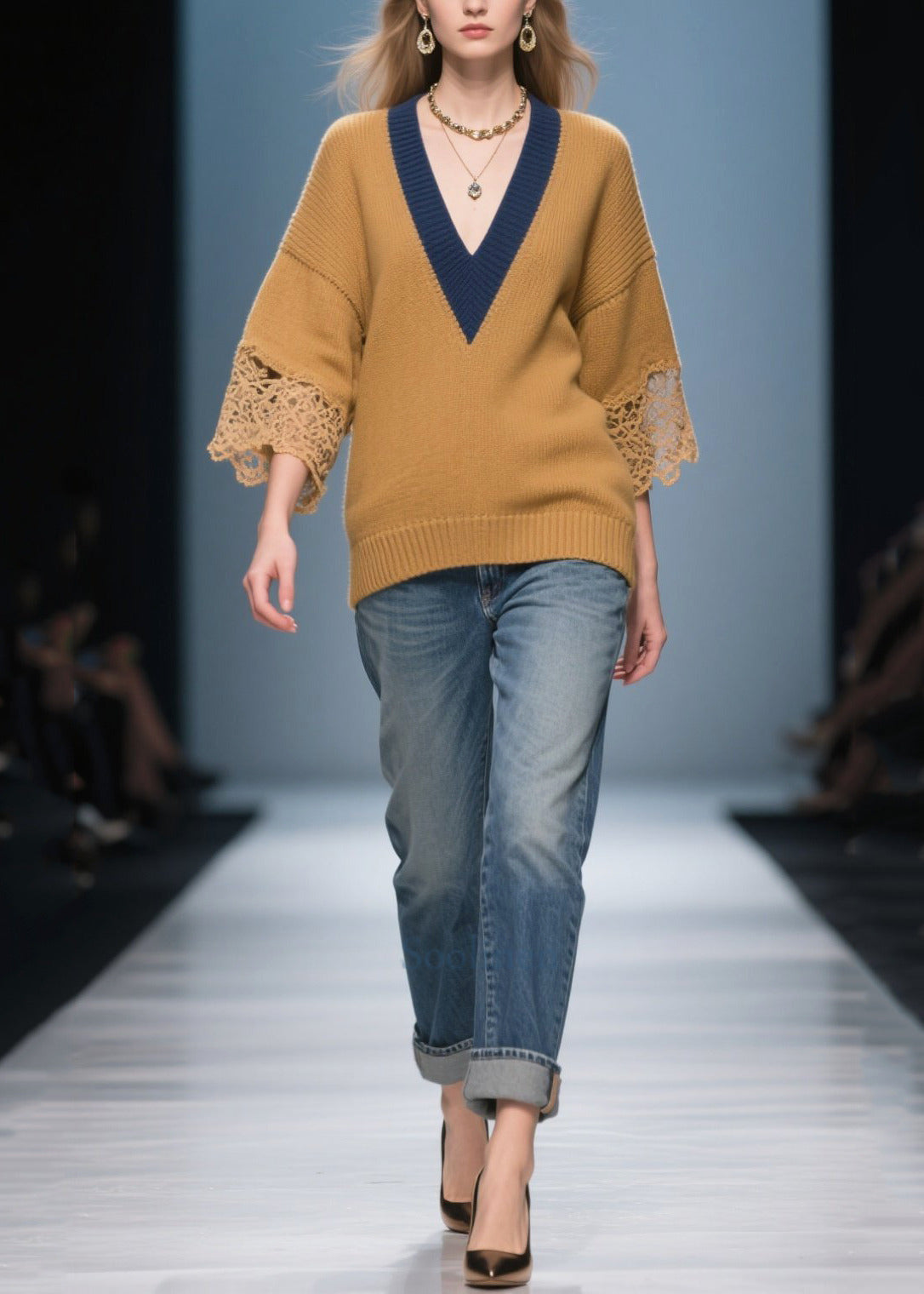 Italian Brown V Neck Patchwork Lace Knit Tops Bracelet Sleeve