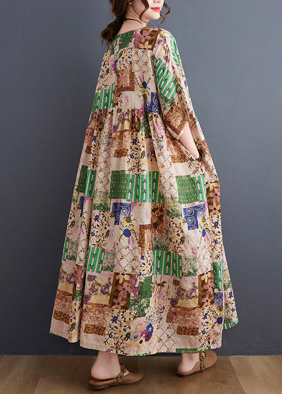 Loose Orange Plaid Wrinkled Print Cotton Maxi Dresses Short Sleeve