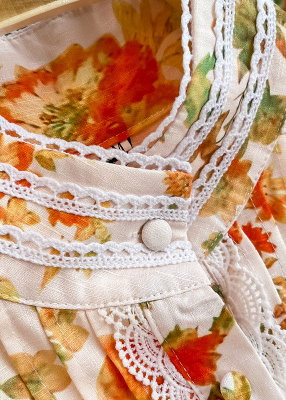 Modern Orange Stand Collar Print Tie Waist Tassel Button Mid Dress Lantern Sleeve