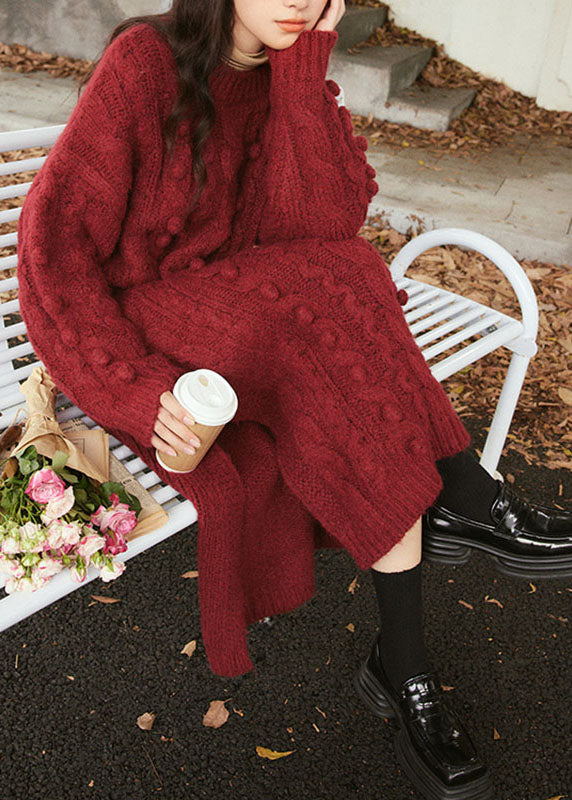 Natural Purplish Red O-Neck Cable Cotton Knit Sweater Maxi Dress Long Sleeve