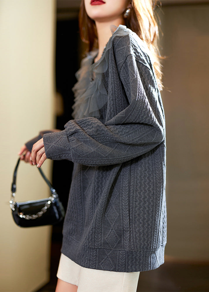New Dark Gray Ruffled Nail Bead Patchwork Cotton Knit Tops Spring