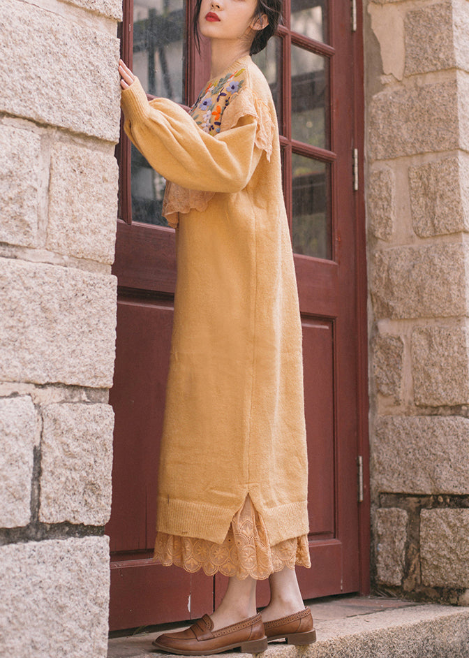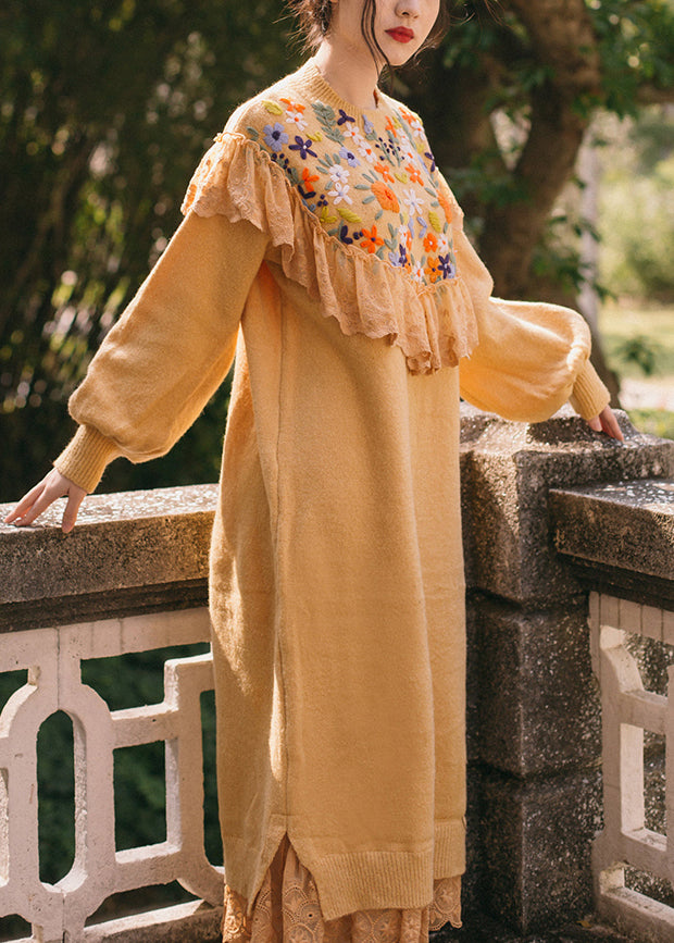 New Orange Ruffled Embroidered Lace Patchwork Cotton Knit Sweater Dress Fall