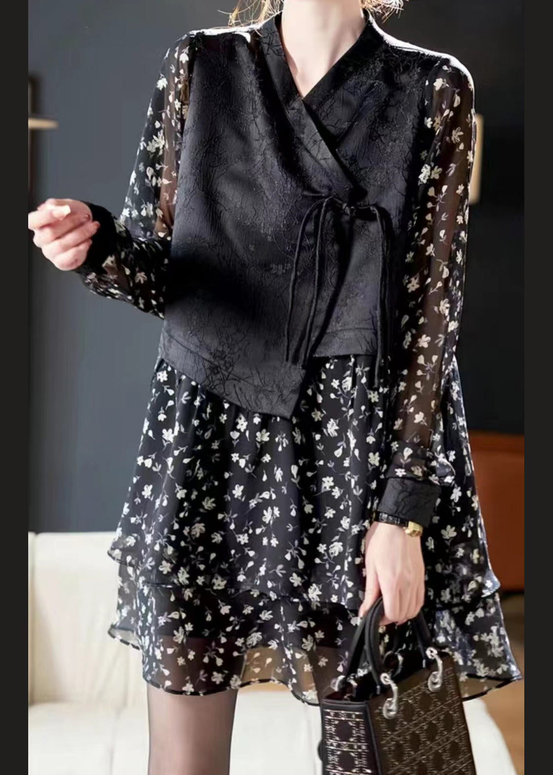 New Retro Black Tasseled Patchwork False Two Pieces Chiffon Dress Summer