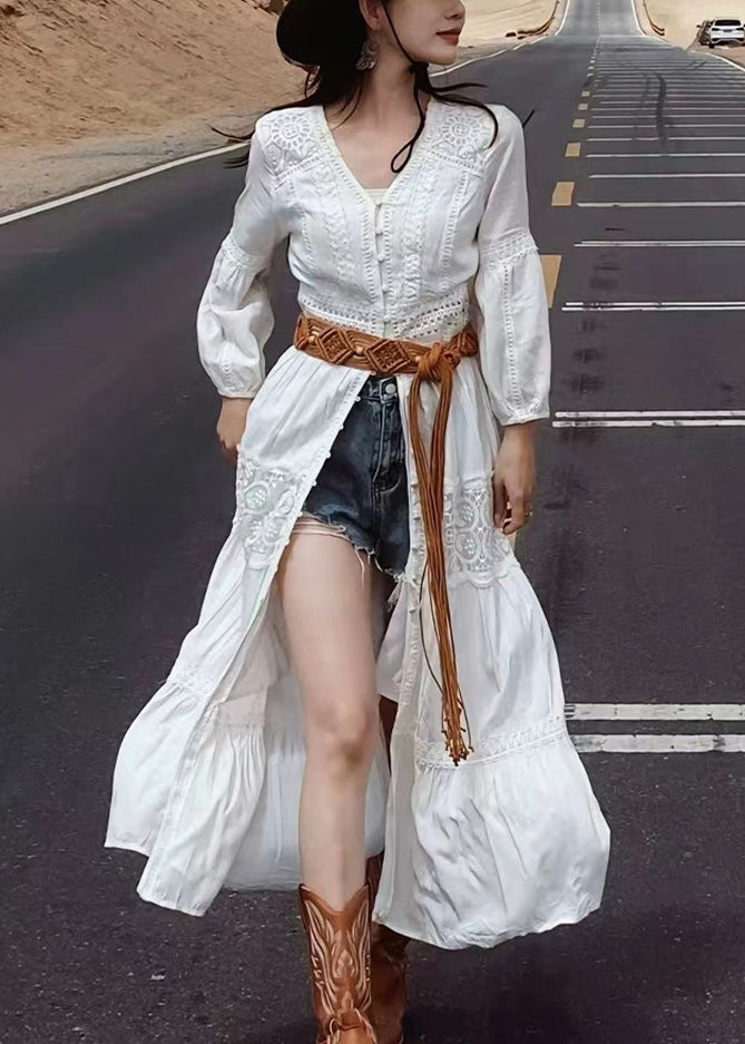 New White V Neck Button Lace Cotton Blouses Dresses Fall