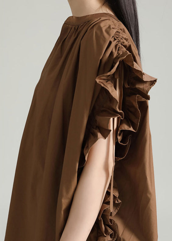 Plus Size Coffee V Neck Ruffled Drawstring Patchwork Cotton Dresses Summer