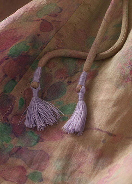 Purple Print Patchwork Cotton T Shirt Tops Tasseled O-Neck Summer