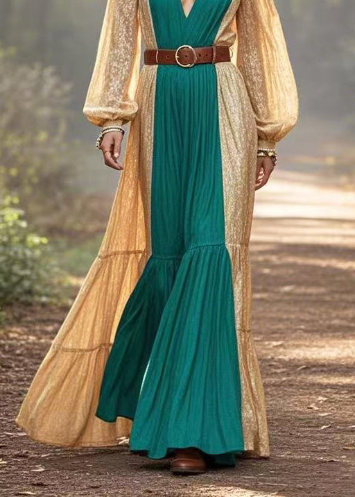 Stylish Colorblock Deep-V Neck Patchwork Cinched Dress Spring