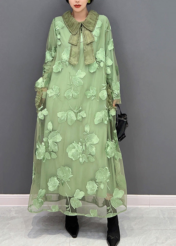 Women Green Peter Pan Collar Embroideried Patchwork Tulle Long Dresses Long Sleeve