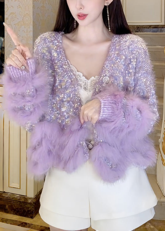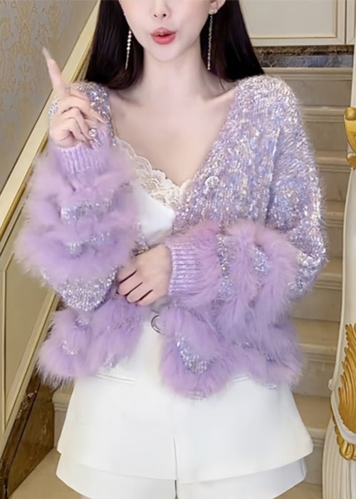 Art Purple V Neck Fluffy Patchwork Knit Coats Spring