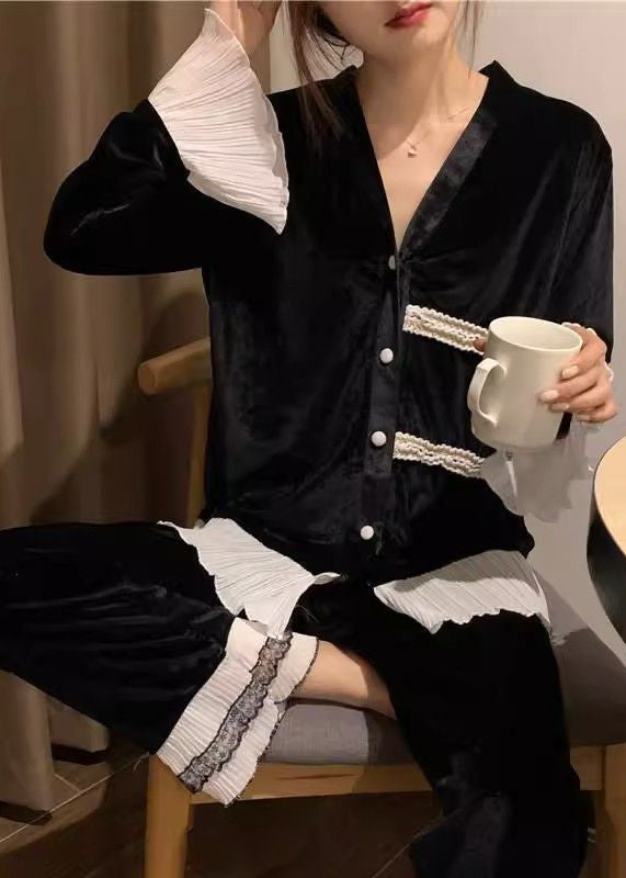 Bohemian Black V Neck Lace Patchwork Silk Velvet Two Pieces Set Spring