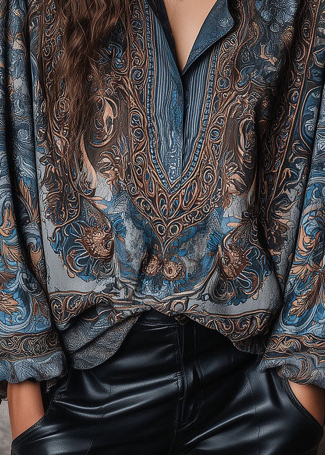Bohemian Blue Peter Pan Collar Print Cotton Shirt Top Fall