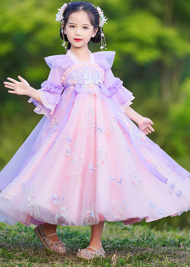 Boho Purple V Neck Patchwork Embroideried Tie Waist Tulle Girls Maxi Dress Half Sleeve