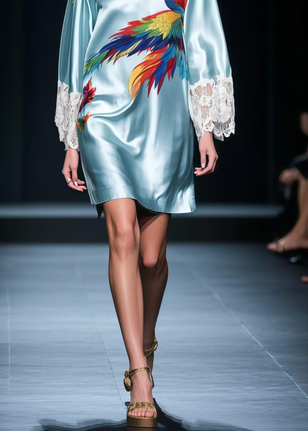 Boho Sky Blue Phoenix Print Patchwork Lace Tea Dresses Summer