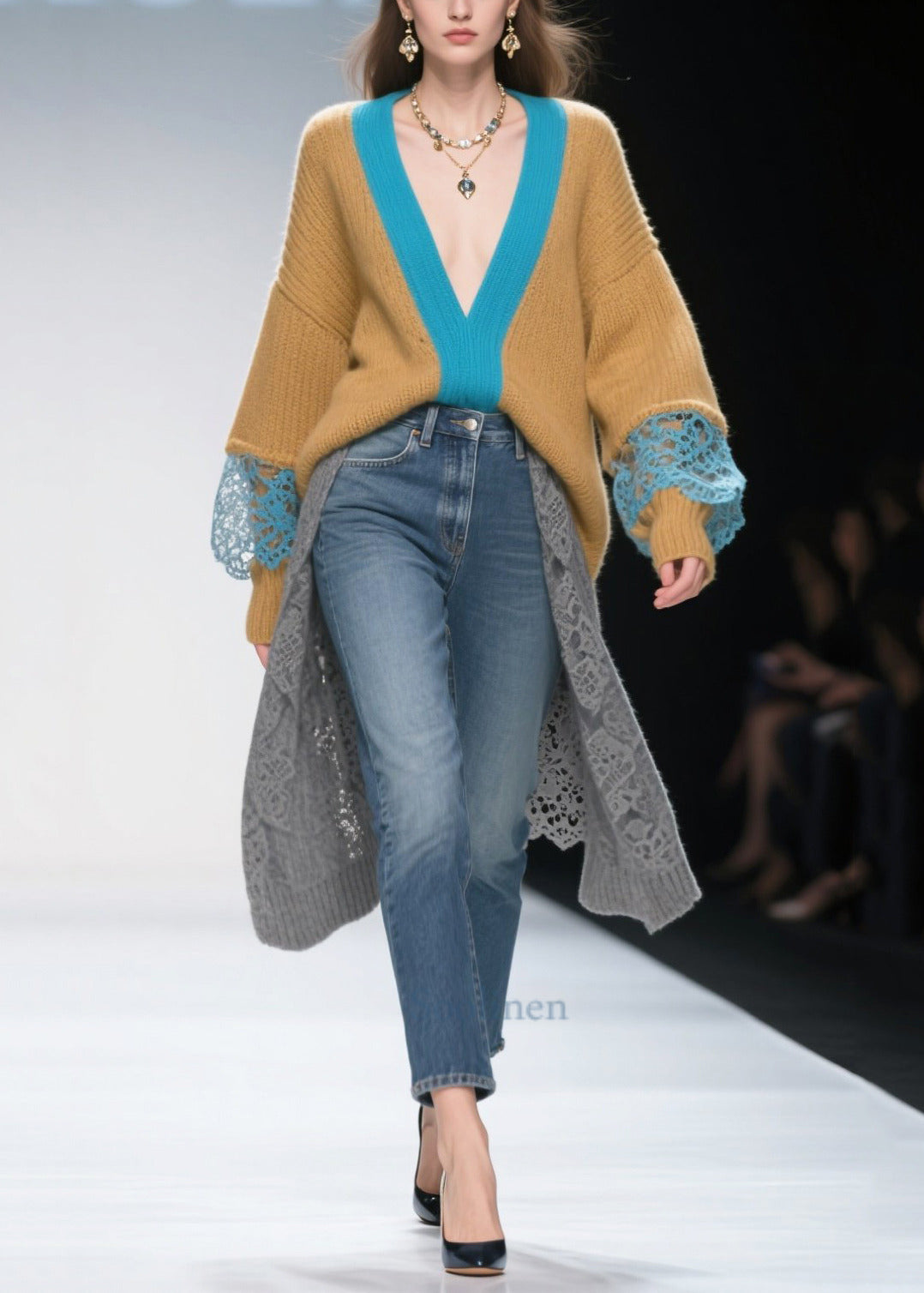 Brown Patchwork Lace Long Sweater Low High Design Winter