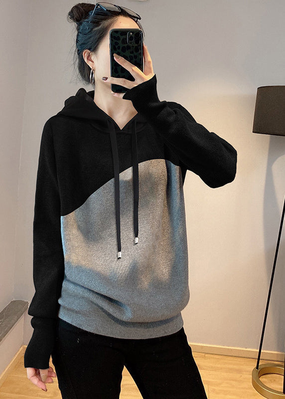 Casual Black Grey drawstring Hooded Patchwork Knit Sweatshirts Top Spring
