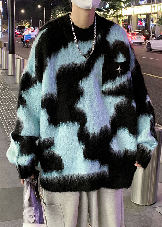 Chic Blue O Neck Patchwork Knit Mens Sweater Winter