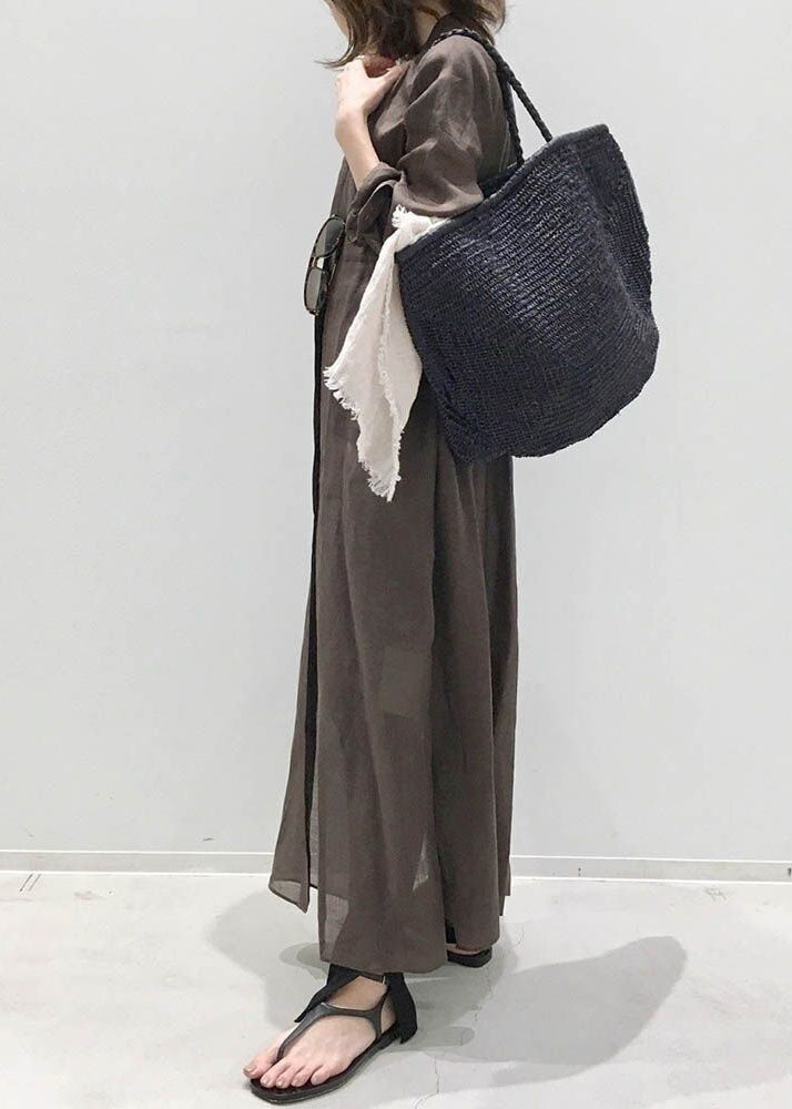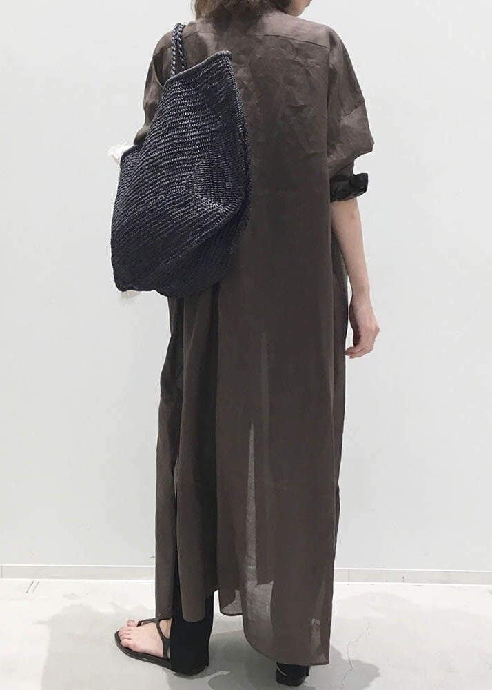 Chic Coffee Stand Collar Cotton Shirts Dresses Long Sleeve