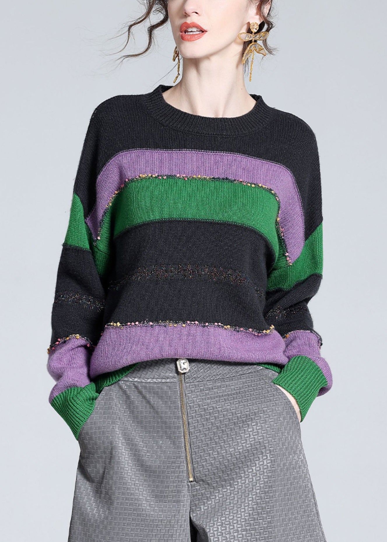 Chic Purple O-Neck Cozy Patchwork Wool Knit Sweater Winter