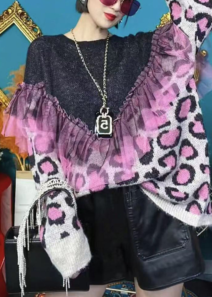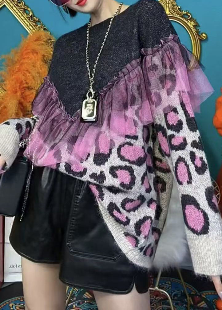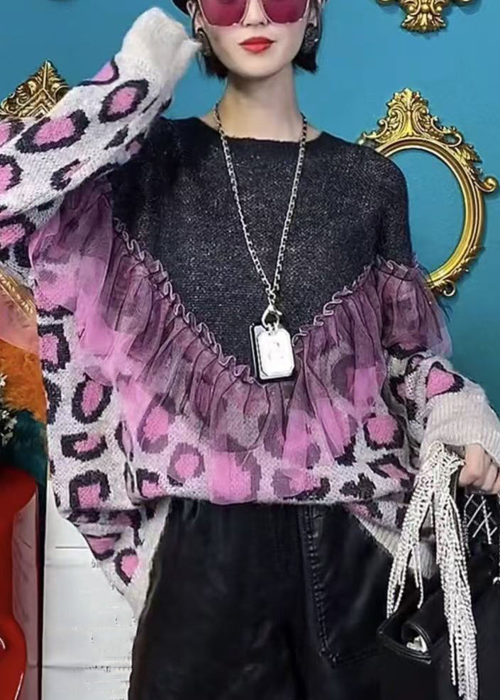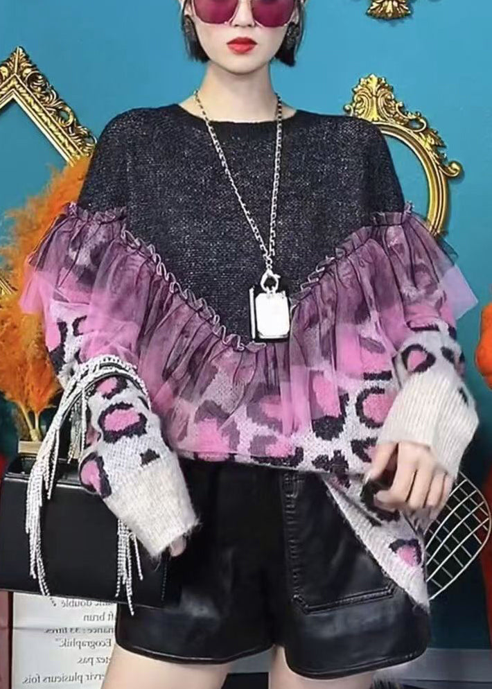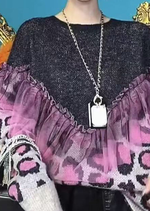 Chic Purple Ruffled Patchwork Knit Sweater Winter