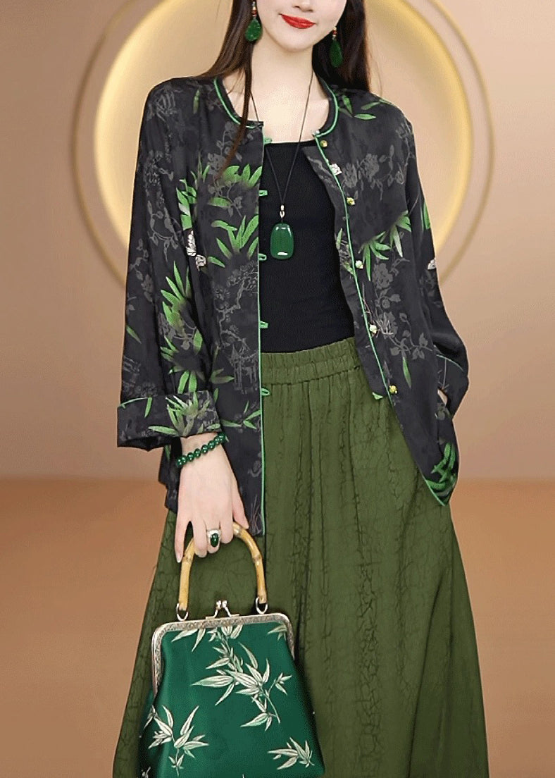 Chinese Style Black O Neck Print Button Silk Cardigan Fall