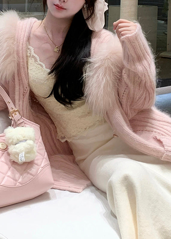 Cute Pink Raccoon Hair Collar Button Cotton Knit Cardigan Spring