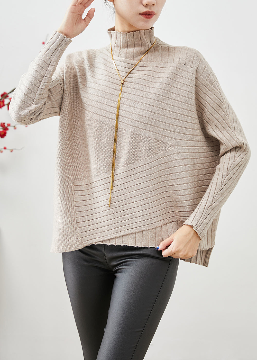Elegant Beige High Neck Asymmetrical Knit Sweater Fall