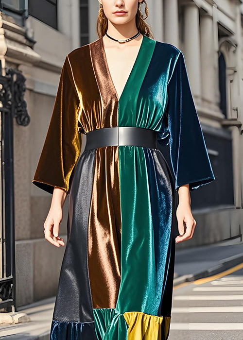 Elegant Colorblock V Neck Sashes Velvet Dress Long Sleeve