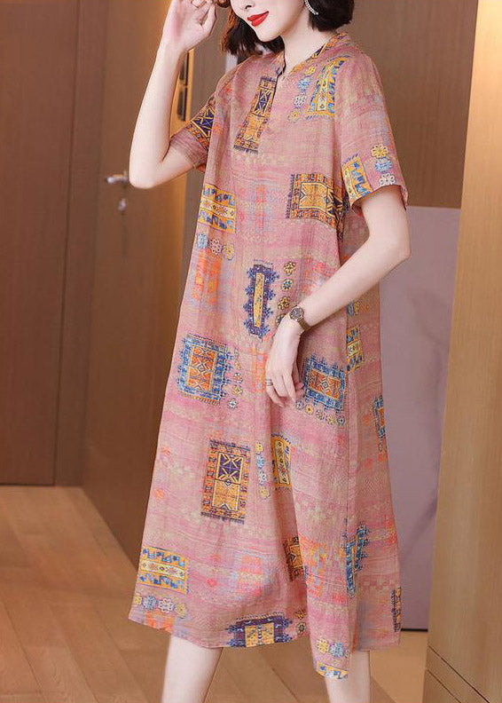 Elegant V Neck Print Linen Long Dresses Short Sleeve