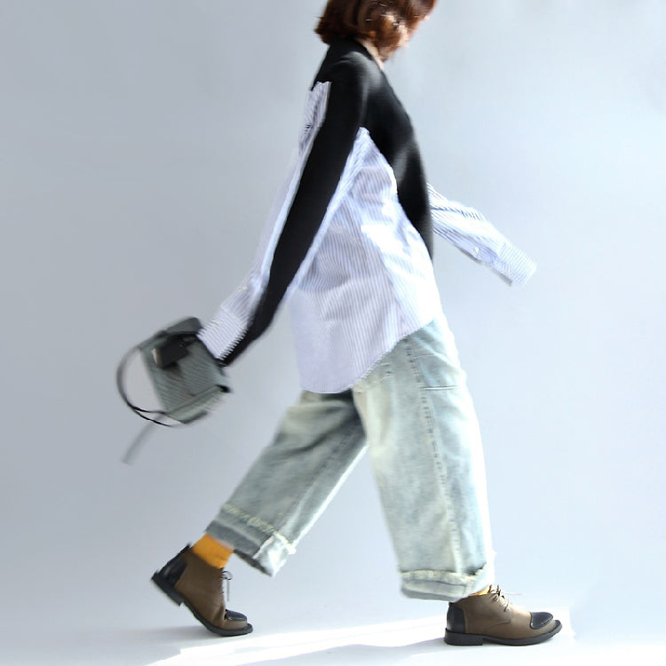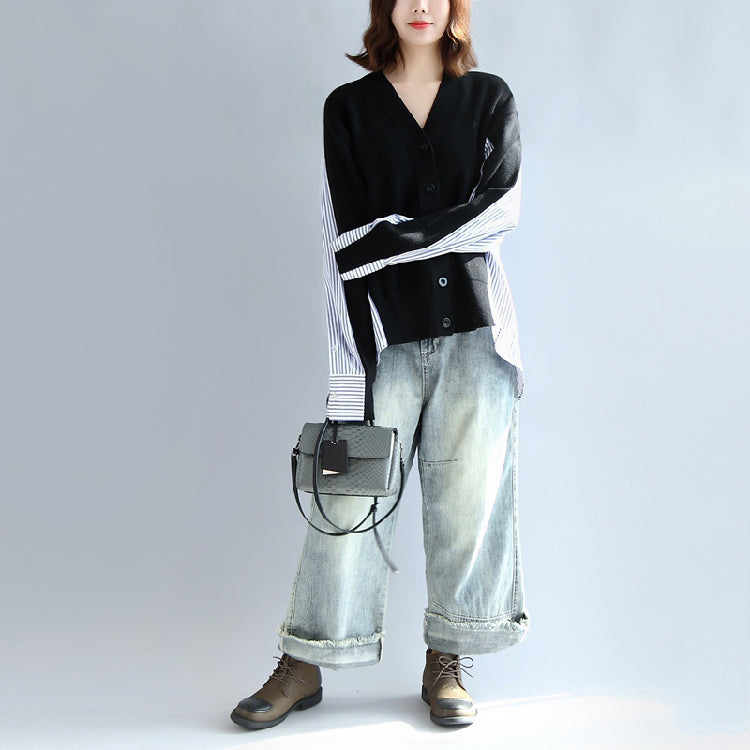 Fashion black striped cotton patchwork sweater tops plus size long sleeve sweater cardigan