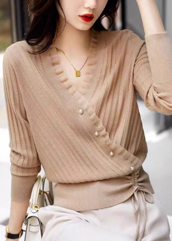 Fitted Blue V Neck Patchwork Drawstring Cotton Knit Sweaters Fall