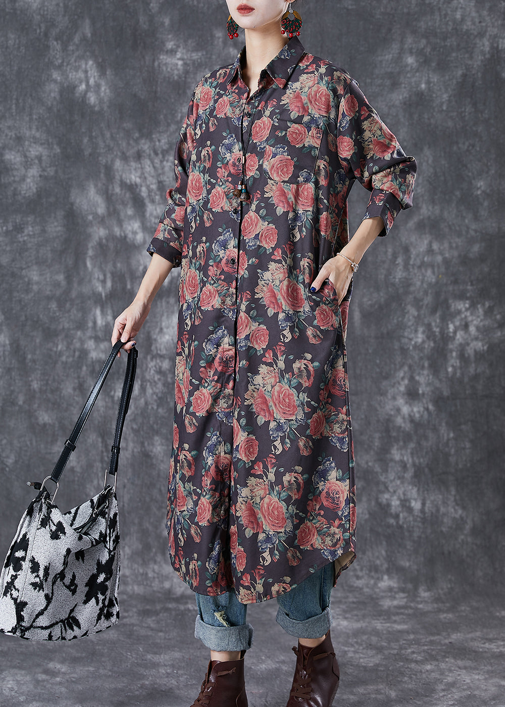 French Black Oversized Rose Print Cotton Shirt Dresses Fall