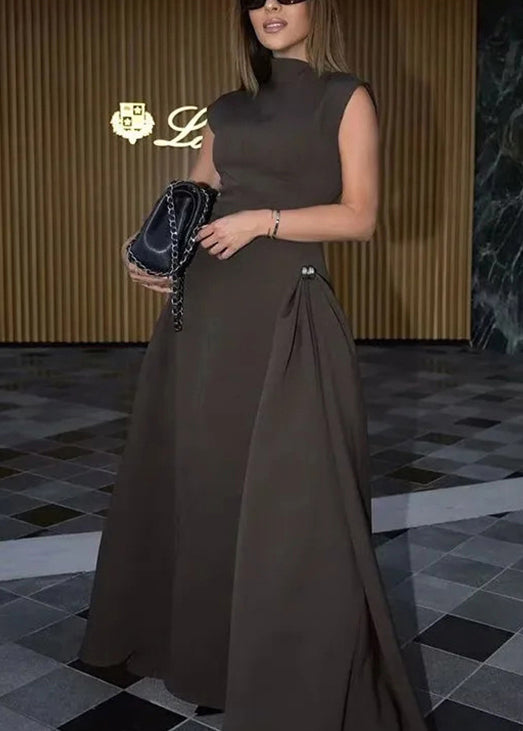 French Coffee Turtleneck High Waist Solid Cotton Long Dress Sleeveless
