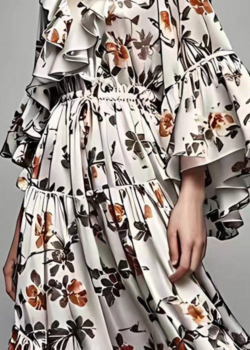 French Grey Ruffled Print Lace Up Cotton Maxi Dresses Flare Sleeve