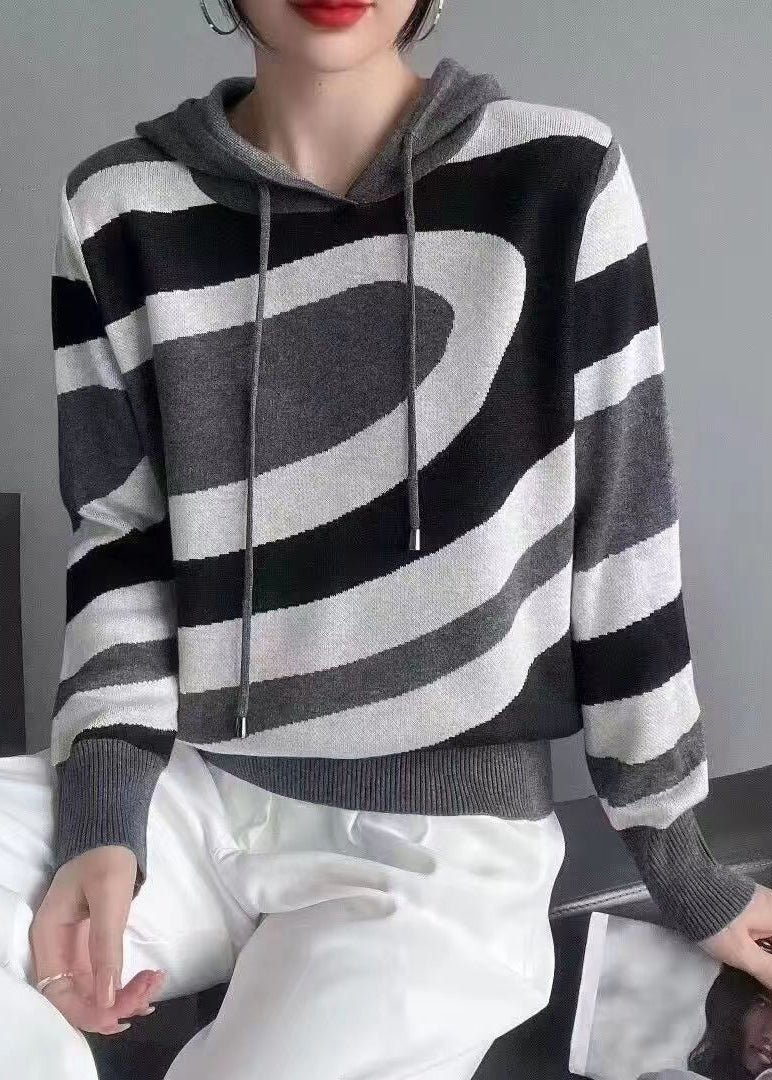 French Khaki Hooded Patchwork Cozy Wool Knit Sweaters Fall
