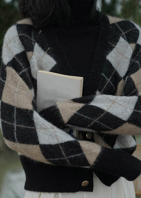 French Plaid V Neck Button Knit Coats Long Sleeve