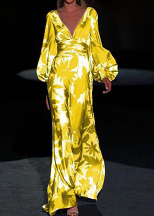 French Rose V Neck Print Cotton Long Dresses Long Sleeve