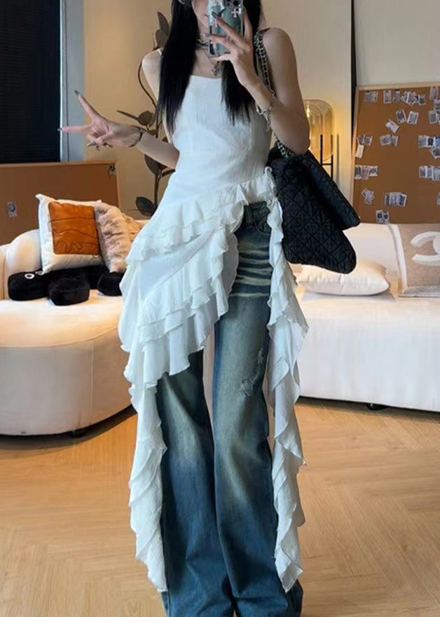 French White Ruffled Solid Cotton Spaghetti Strap Dresses Sleeveless