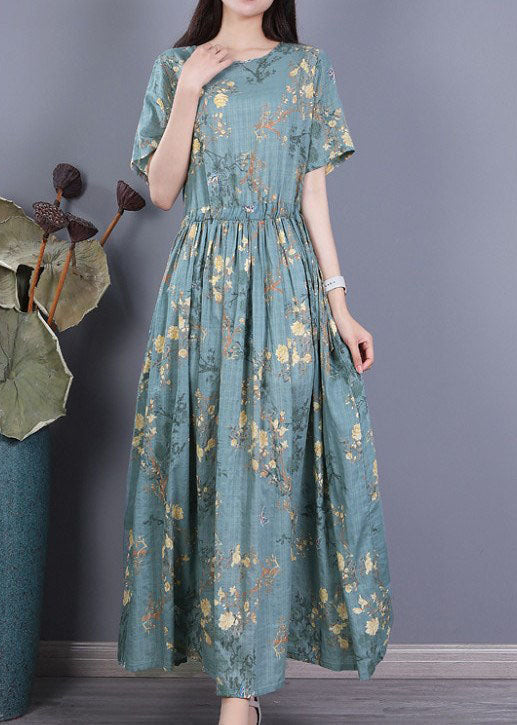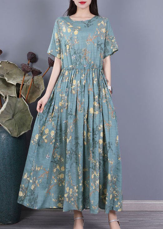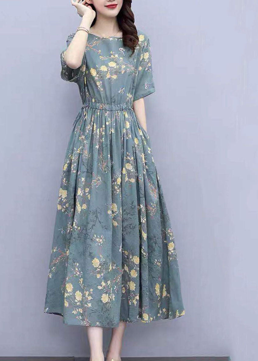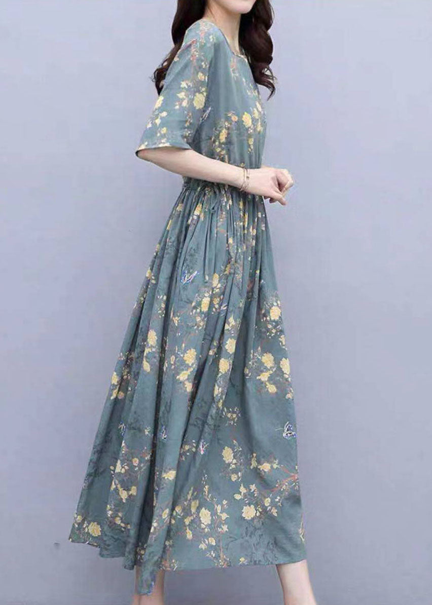 Grey Blue Print Cotton Cinch Dress O-Neck Drawstring Short Sleeve