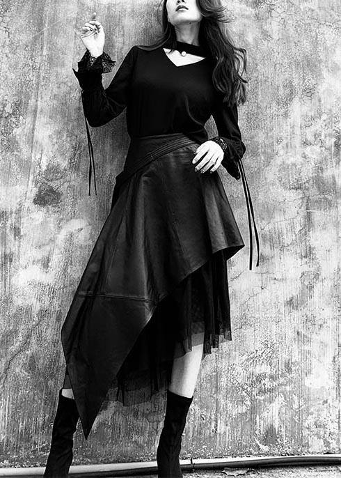 High Waist Spring Pu Stitching Lace A-line Skirt